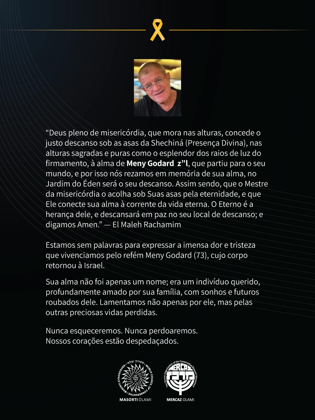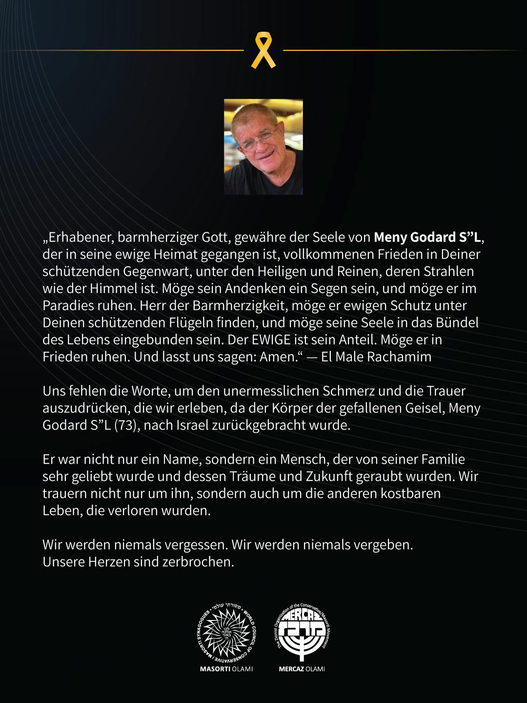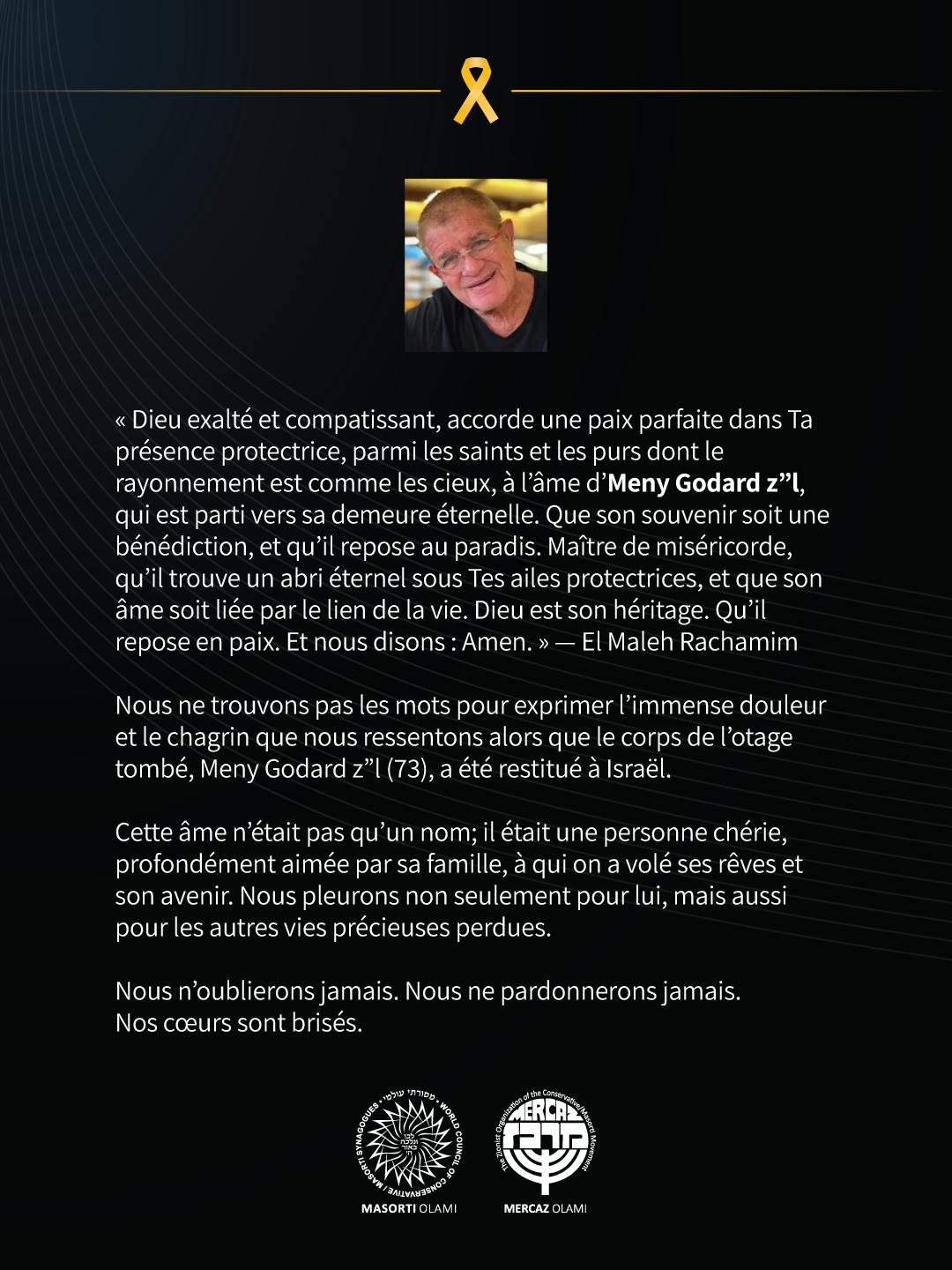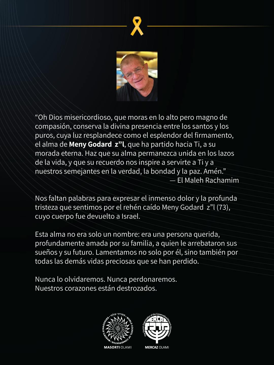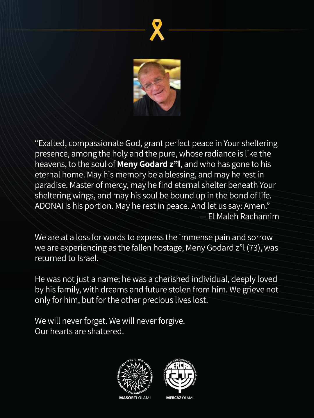 We are at a loss for words to express the immense pain and sorrow we are experiencing as the fallen hostage Meny Godard z”l (73) was returned to Israel.