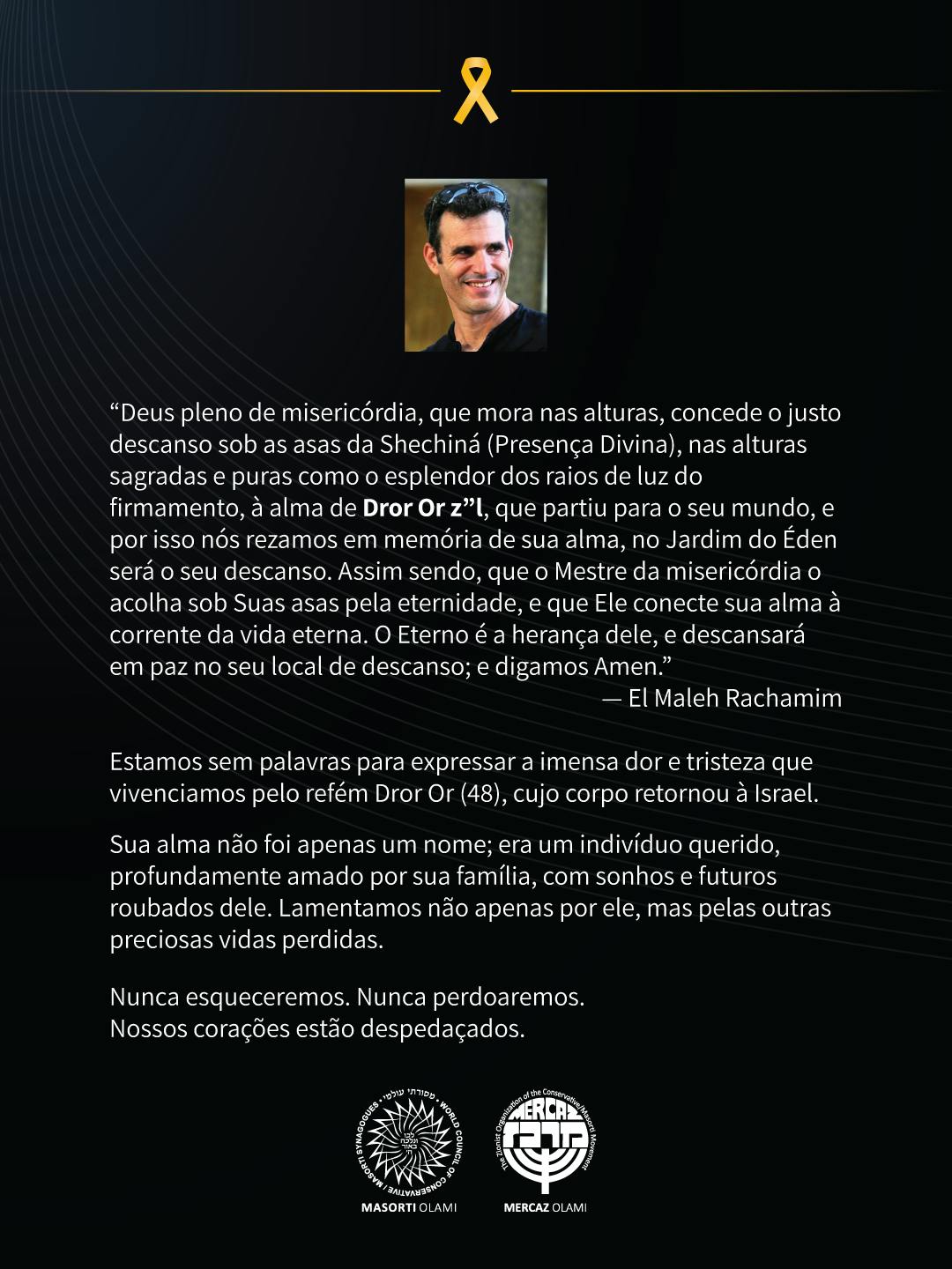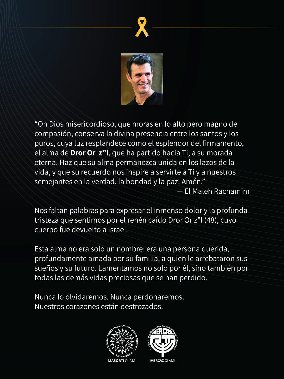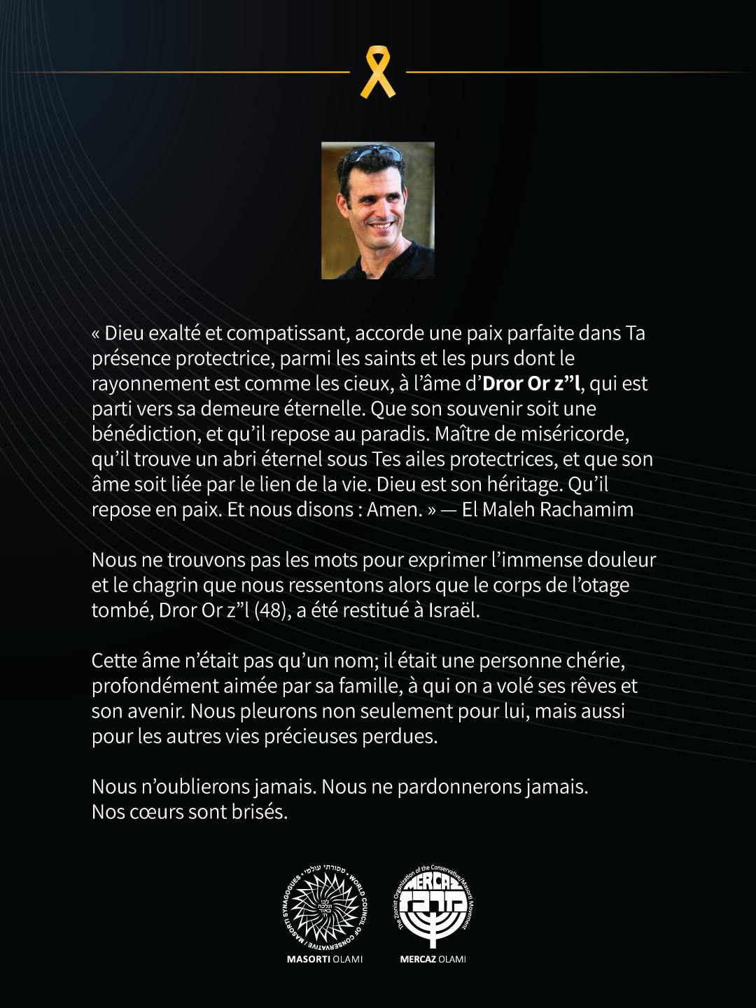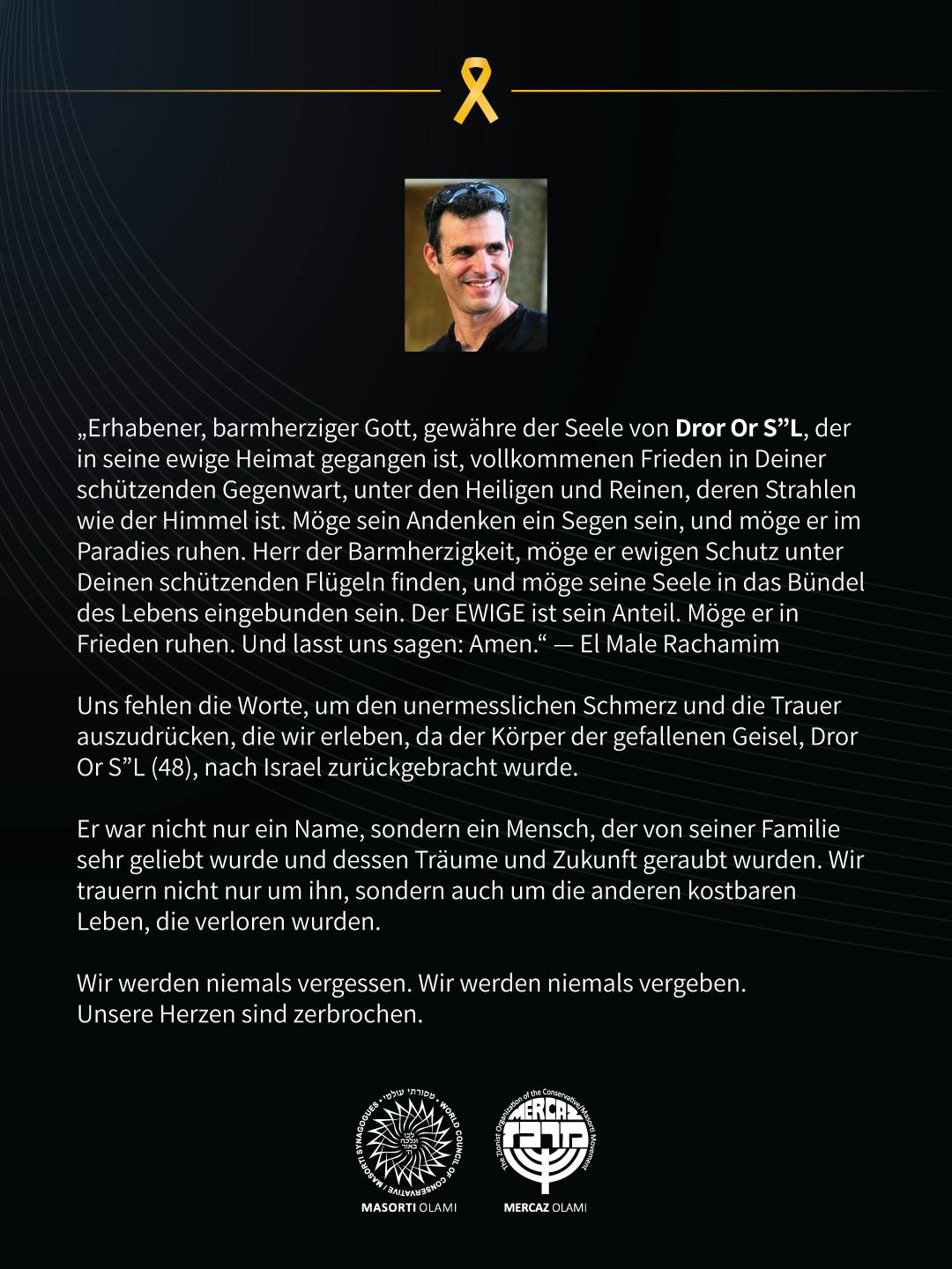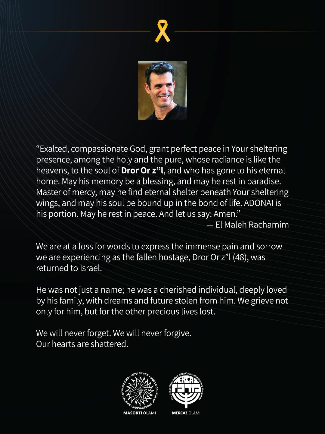 We are at a loss for words to express the immense pain and sorrow we are experiencing as the fallen hostage, Dror Or z”l (48), was returned to Israel.