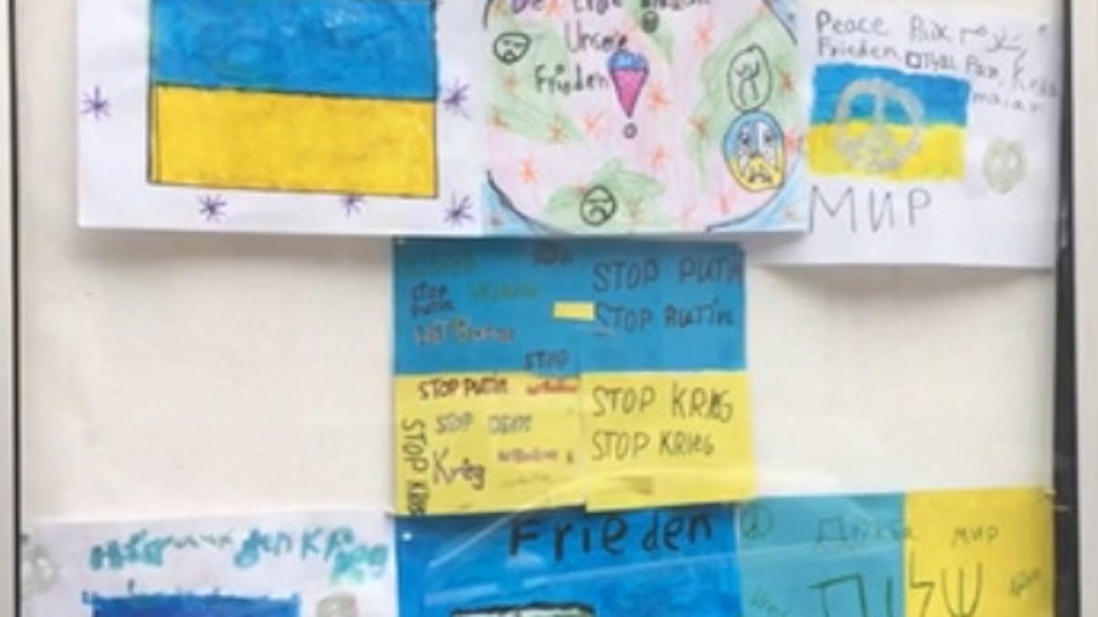 Posters calling for peace in Ukraine cover the front of the Berlin Masorti school as they prepare to welcome Ukrainian refugees