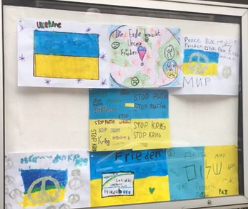 Posters calling for peace in Ukraine cover the front of the Berlin Masorti school as they prepare to welcome Ukrainian refugees